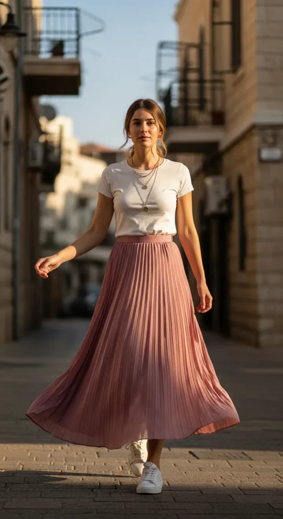 A high-waisted pleated maxi skirt in dusty rose paired with a tucked-in fitted tee feels youthful yet respectful. The movement of the pleats catches desert breezes beautifully during city explorations.