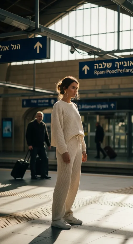 A coordinated knit set in cream offers comfort for travel between cities while staying polished. It’s cozy yet presentable.