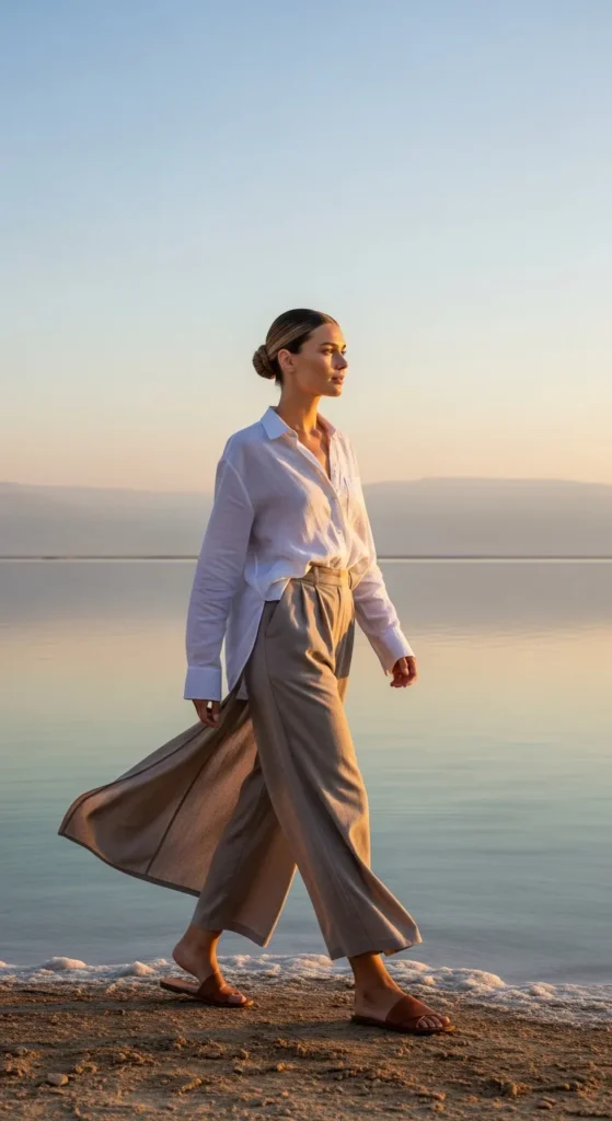 A loose white oversized shirt layered over wide-leg taupe trousers feels fresh and breathable for a visit to Dead Sea.