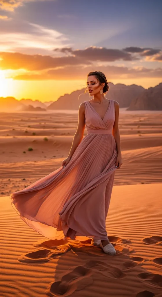A dusty blush maxi dress with subtle pleats feels romantic yet practical for sunset moments in Wadi Rum. The fabric floats gently without clinging in desert heat.
