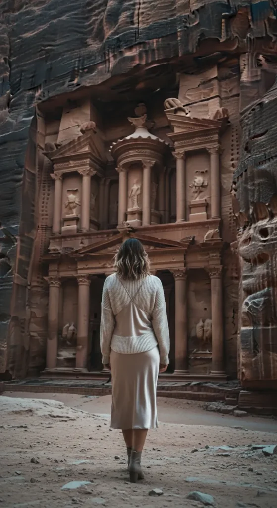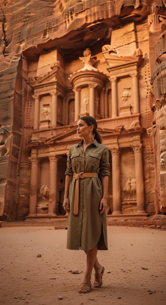 Stylist Suggestion: Add layered gold necklaces and leather slide sandals. The soft metallic tones mirror Petra’s rose cliffs, while flat leather footwear keeps you steady on uneven stone paths.