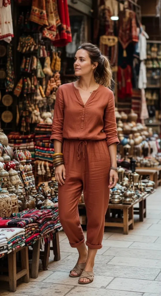A modest long-sleeve linen romper in muted clay tones balances ease and style for wandering local markets.