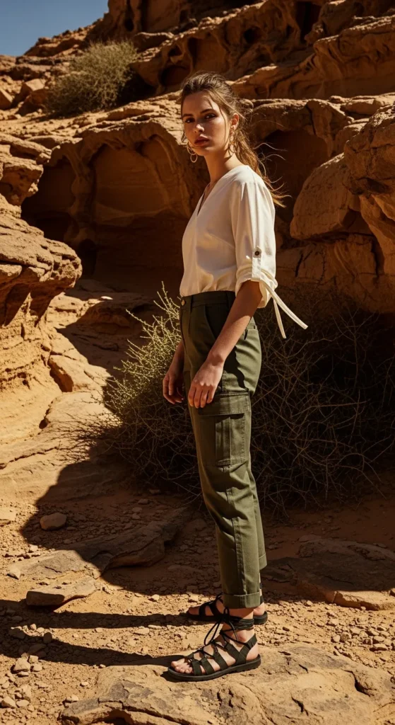 High-waisted olive cargo trousers with a tucked cream cotton blouse balance structure and softness for desert jeep rides and casual exploration.
