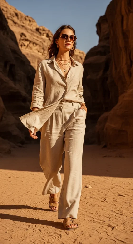 A relaxed beige linen button-down tucked into wide-leg trousers creates breathable elegance perfect for exploring Petra. The silhouette flows naturally while keeping you cool under golden desert sunlight.