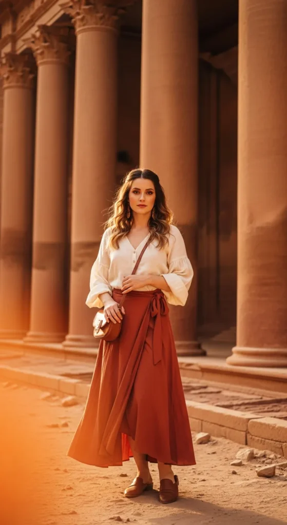 A breathable terracotta wrap skirt styled with a soft ivory long-sleeve blouse feels elegant for exploring ancient ruins and markets.
