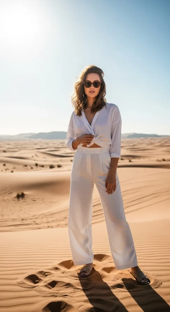 Flowy palazzo pants with a matching loose top create effortless symmetry against vast desert backdrops.
