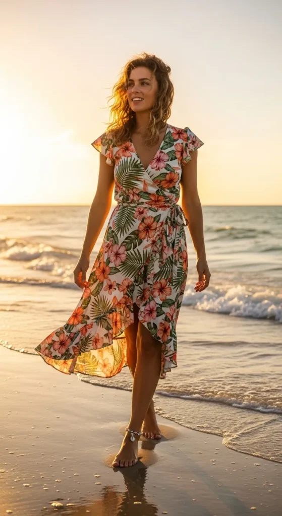 A floral wrap dress with soft ruffles captures the essence of tropical femininity. It flatters effortlessly while moving beautifully with every step.