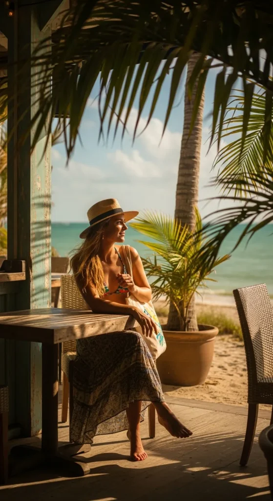 An oversized white linen shirt worn open over a vibrant tropical bikini feels relaxed yet intentional. It’s the kind of outfit that transitions effortlessly from beach lounging to a casual seaside café.