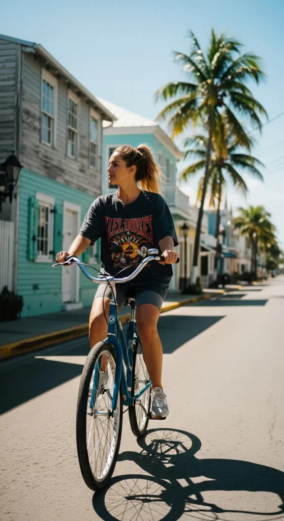 An oversized graphic tee paired with biker shorts offers a sporty, off-duty look that still feels stylish. It’s perfect for bike rides or casual exploring.
