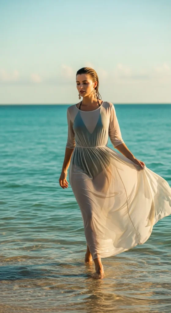 A sheer maxi dress layered over a swimsuit adds drama without effort. The flowy silhouette catches the wind beautifully, making every step feel like a cinematic moment.