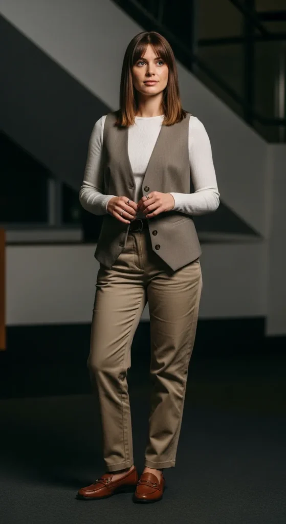 A tailored vest over a simple top with khaki pants creates a quietly stylish outfit. It feels fresh, modern, and ideal for elevating everyday basics.