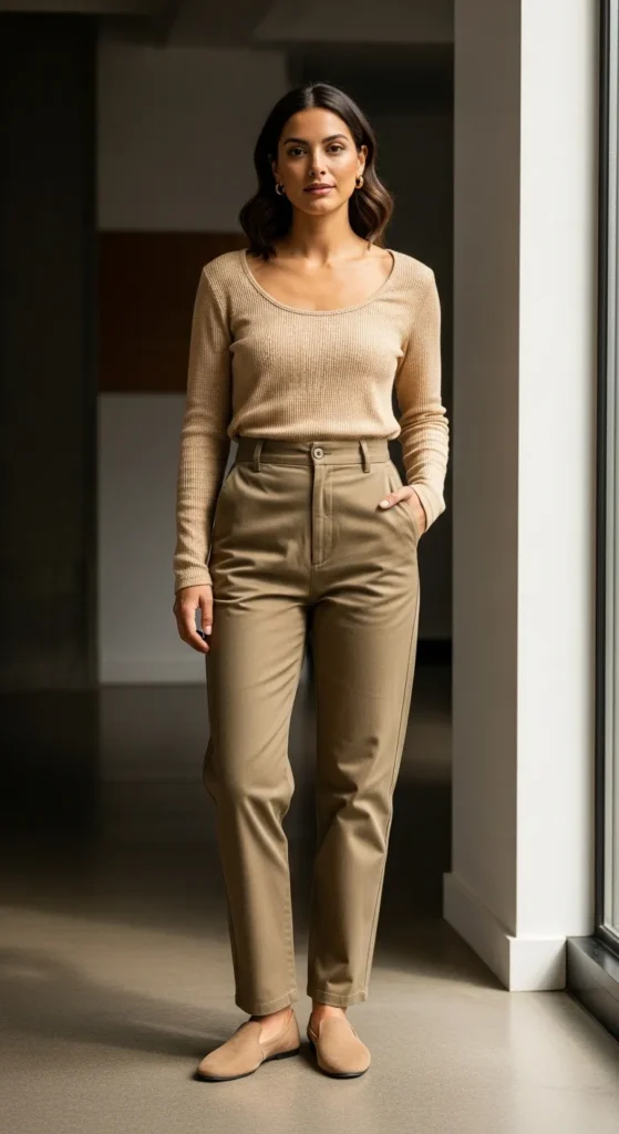 Pairing khaki pants with similar warm neutrals creates a soft monochrome look. It feels cohesive, calm, and quietly stylish for everyday wear.