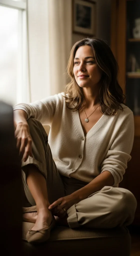 Stylist Suggestion: Button the cardigan halfway and add a small pendant necklace. This creates shape and draws attention upward, balancing the relaxed silhouette of the pants.