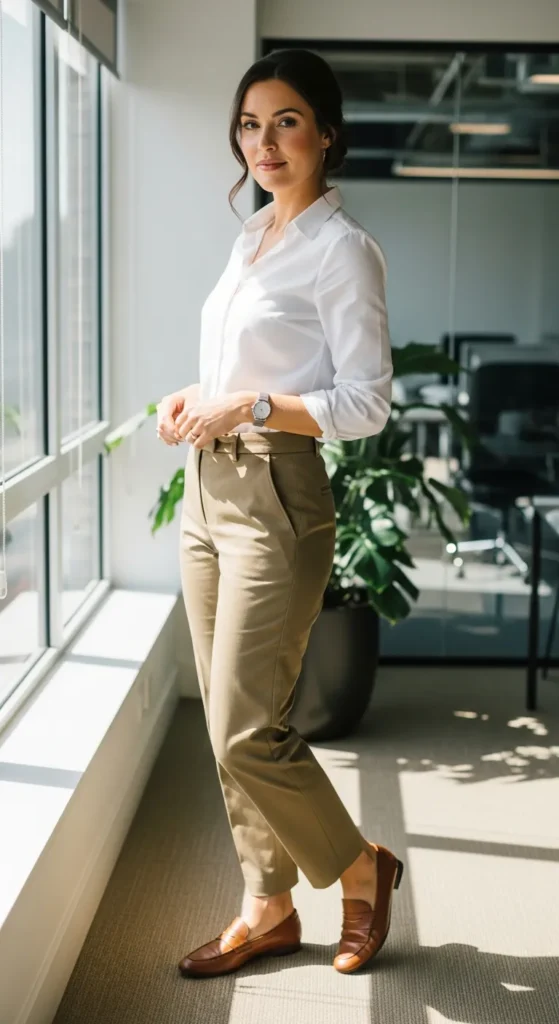 A classic white button down tucked into khaki pants feels instantly fresh and intentional. This outfit brings structure without stiffness, making it ideal for casual workdays or polished daytime plans that still call for comfort.
