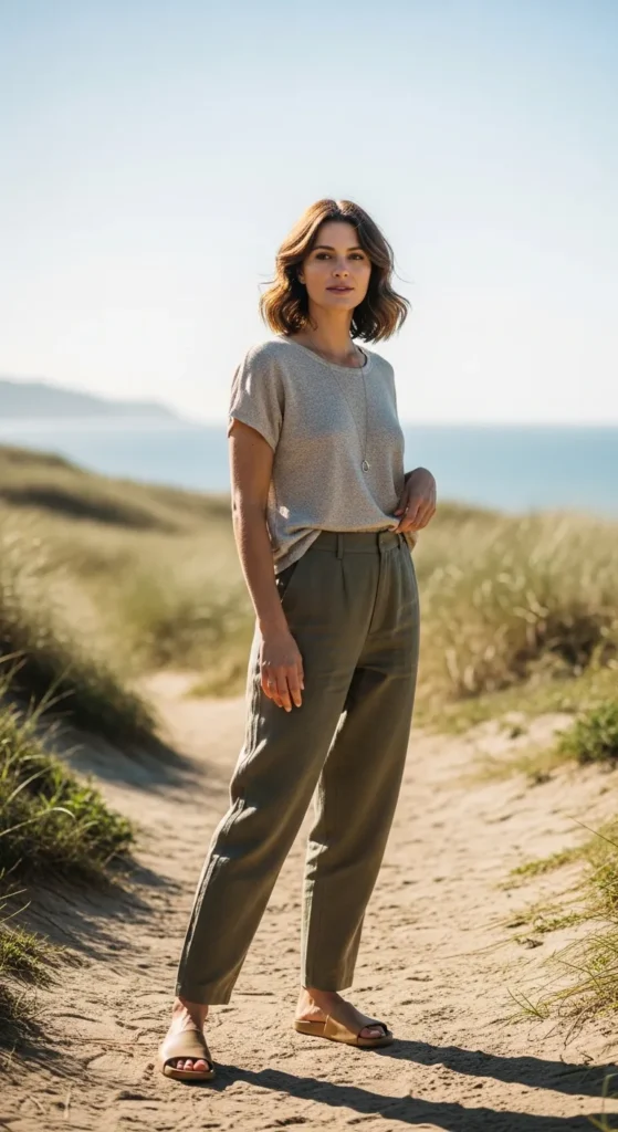 Linenblend khaki pants with a breathable top feel airy and relaxed. This outfit is perfect for warm, busy days when comfort and style need to coexist naturally.