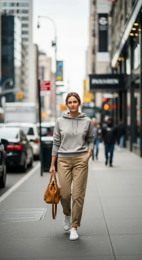 A neutral hoodie paired with khaki pants proves comfort can still look styled. This outfit feels modern, relaxed, and perfect for casual days that still deserve a polished touch.