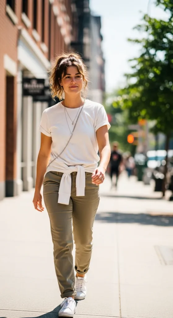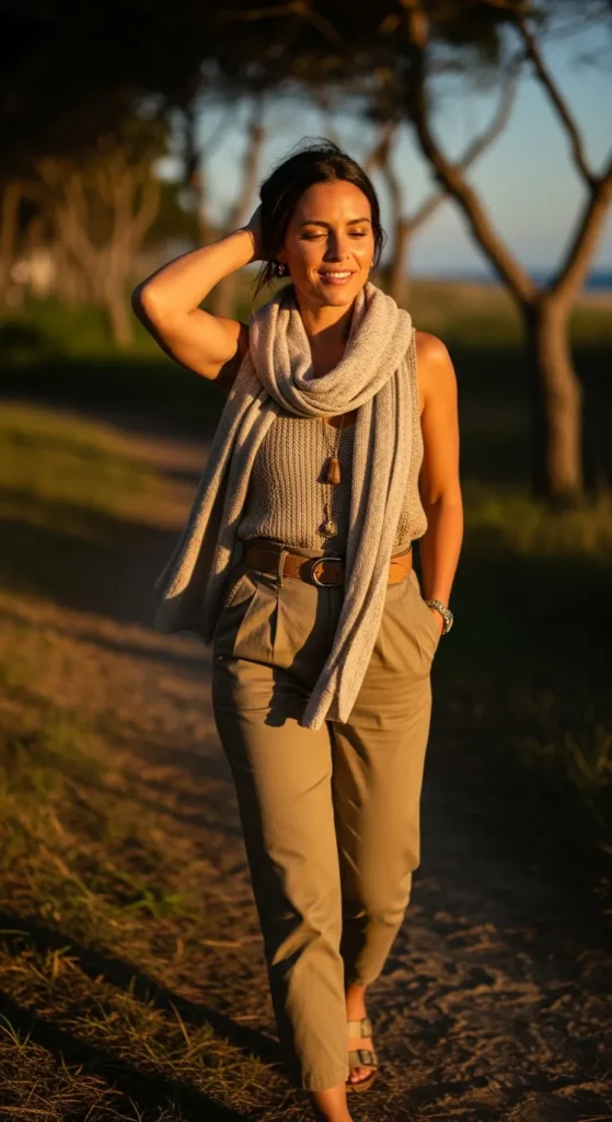 A knit tank tucked into khaki pants creates a soft yet structured look. It’s flattering, breathable, and ideal for warm days when you still want polish.
