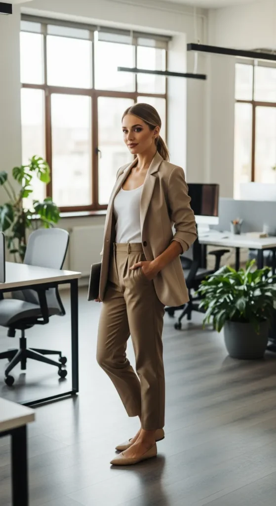 Khaki pants and a neutral blazer strike that perfect smart-casual middle ground. This look works beautifully for casual offices, meetings, or days when you want to feel capable and composed.