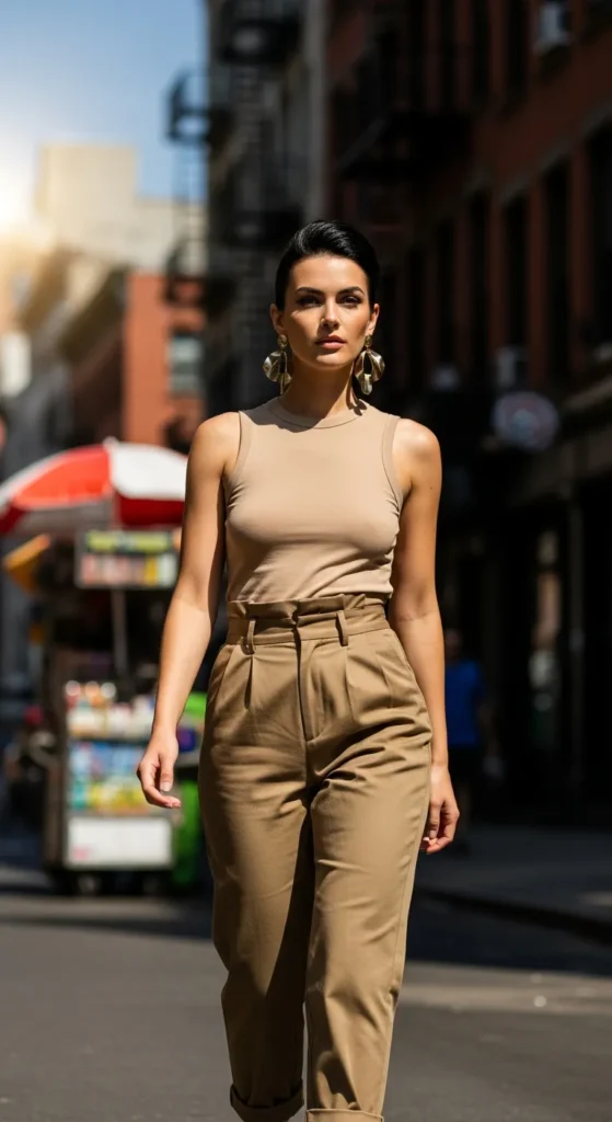Khaki pants with a sleeveless neutral top feel clean, fresh, and perfect for warmer days. It’s simple, breathable, and easy to style while still looking refined.