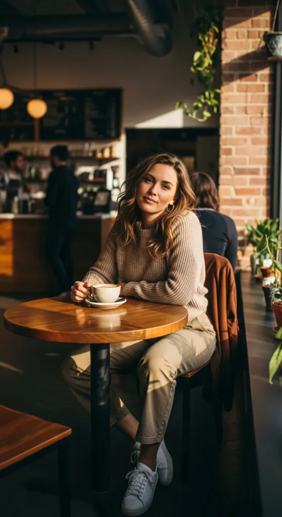 Khaki straight leg pants paired with a soft neutral knit create an outfit that feels calm and put together. It’s cozy without looking lazy, making it perfect for slow mornings, errands, or relaxed meet ups with friends.