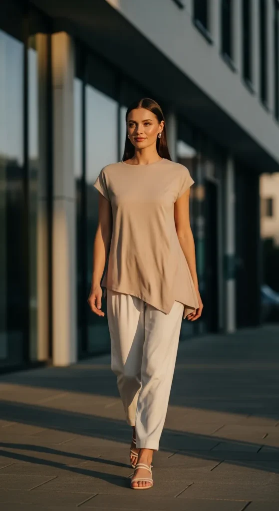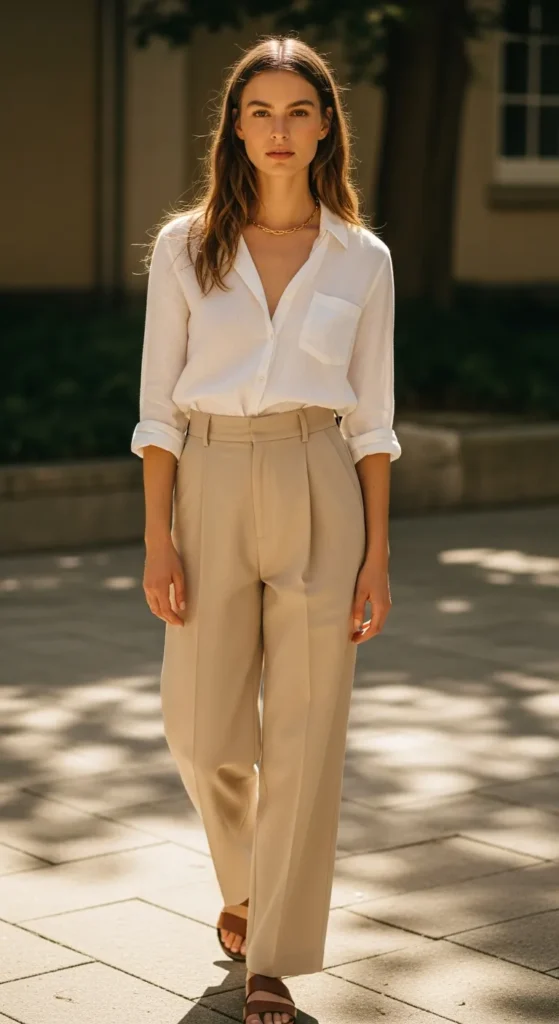 Stylist Suggestion: Roll the sleeves and layer a thin gold chain. The rolled cuffs add shape, while subtle jewelry prevents the minimalist outfit from feeling flat.