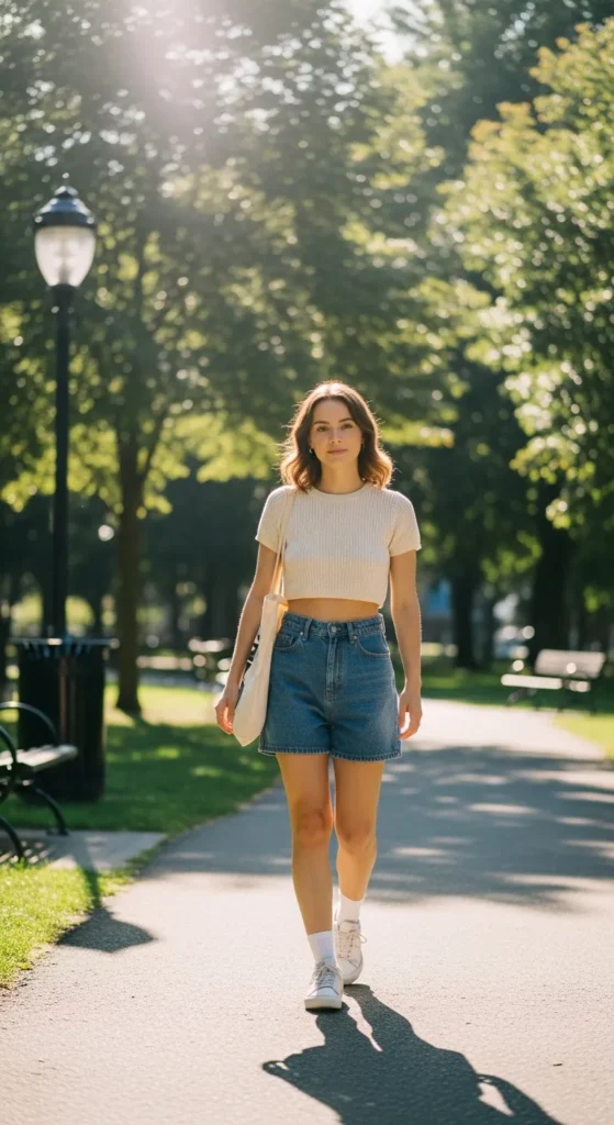 A soft cropped knit in neutral tones paired with tailored denim shorts feels cozy yet breathable. It blends Korean softness with everyday practicality, making it ideal for relaxed weekend plans.