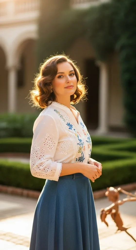 An eyelet embroidered blouse styled with a denim midi skirt feels romantic and timeless. The delicate cut-outs contrast beautifully with sturdy denim texture.