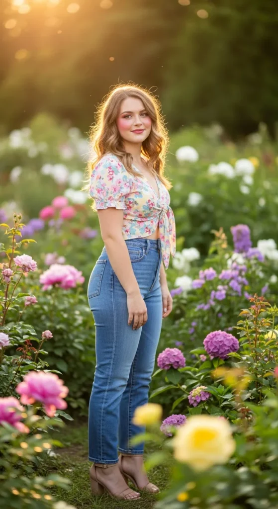 A small-print floral tie-front blouse styled with light-wash denim feels flirty yet wholesome. The front tie detail adds movement and shape while keeping everything soft and approachable.