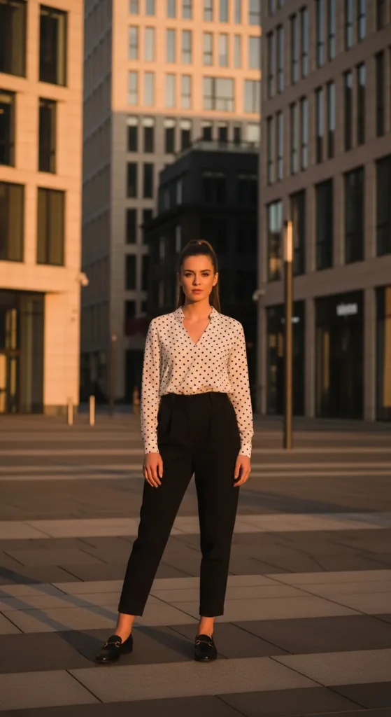 A small polka dot blouse tucked into high-waisted trousers feels playful yet sophisticated. The pattern adds charm while the trousers maintain maturity and structure.