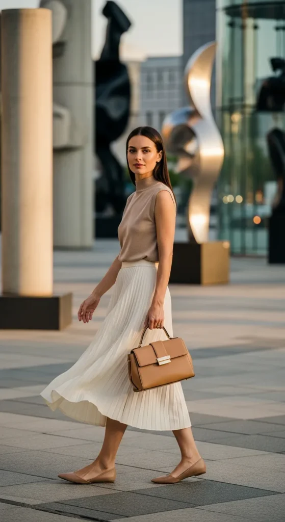 A sleeveless mock-neck top tucked into a flowy pleated midi skirt creates graceful vertical lines. It feels elegant but wearable, perfect for summer dinners or museum afternoons.