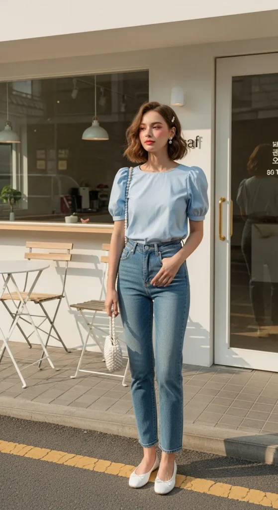 A pastel puff sleeve blouse in baby blue or blush paired with straight-leg jeans feels romantic yet modern. The gentle volume balances the clean denim lines, creating that effortless Korean café-girl aesthetic perfect for warm summer afternoons.