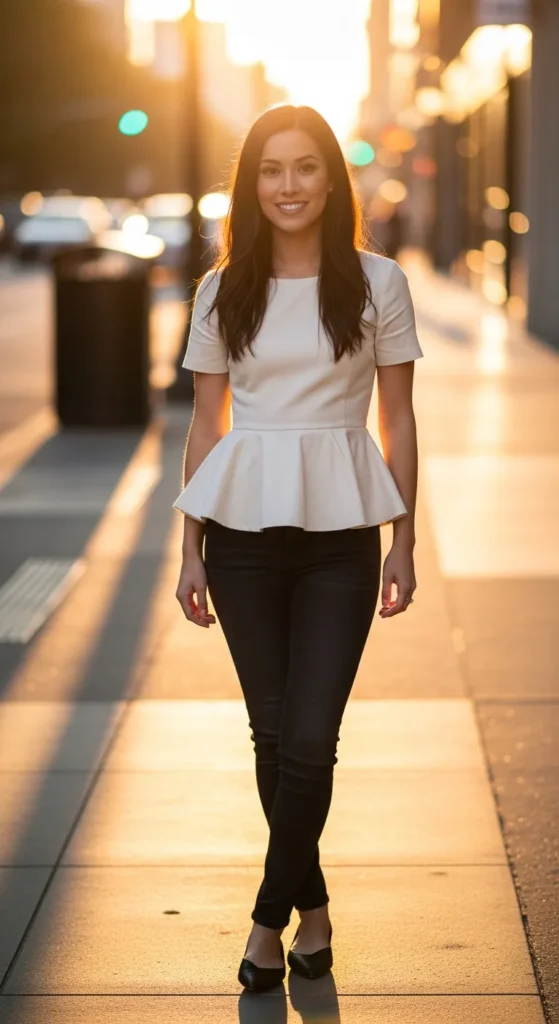 A subtle peplum top creates a flattering waistline while slim jeans keep the outfit balanced. The shape feels feminine yet modern, echoing understated Korean elegance.