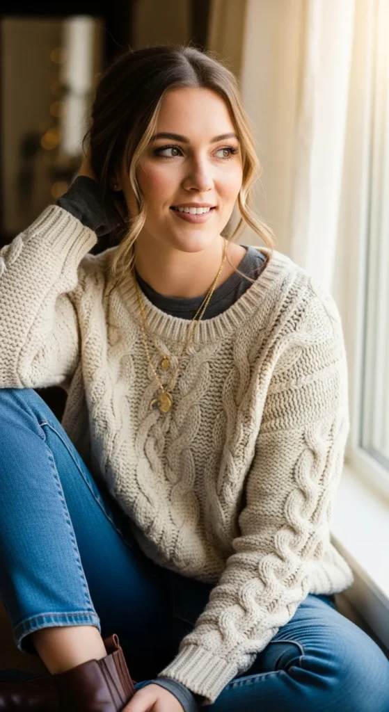 A cable knit sweater layered over a thin base layer adds warmth and visual interest. This simple combination feels timeless, cozy, and easy to wear all winter long.