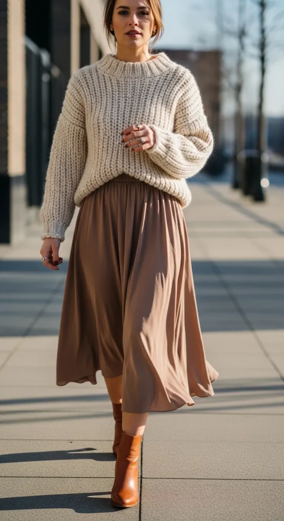A chunky knit sweater paired with a flowy midi skirt creates contrast that feels cozy and feminine. This layered look moves beautifully while keeping you warm.