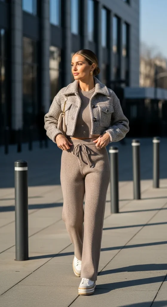 A cropped jacket layered over a fitted top with high-waist knit pants creates warmth while flattering the silhouette. It’s cozy without feeling bulky or heavy.