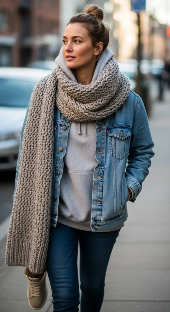 A classic denim jacket layered over a hoodie feels nostalgic and comforting. Adding a thick scarf brings extra warmth and turns a simple outfit into a cozy winter staple.