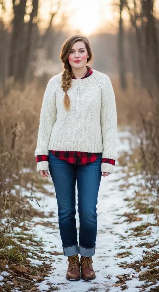 Layering a flannel shirt under a knit sweater adds warmth and subtle texture. Paired with jeans, it feels familiar, cozy, and perfect for everyday winter moments.