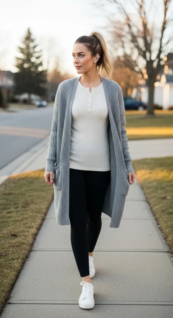 This layered combo feels like wearing a blanket while still looking polished. A ribbed thermal under a long cardigan paired with leggings creates warmth without bulk, ideal for everyday winter routines.