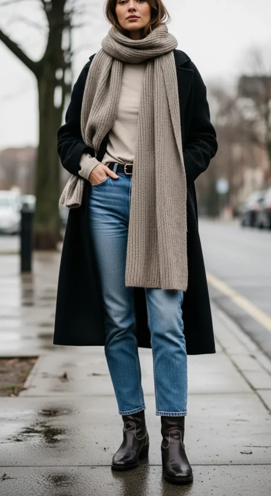 Stylist Suggestion: Choose a scarf with texture rather than bold color. Texture adds depth without overpowering the simplicity of the outfit.
