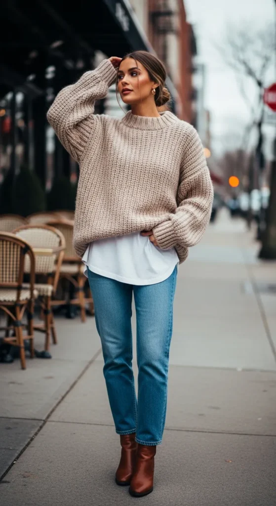 A slouchy oversized knit layered over a soft cotton tee with straight-leg jeans feels effortlessly cozy. It’s relaxed without looking lazy, perfect for days when comfort matters but style still counts.
