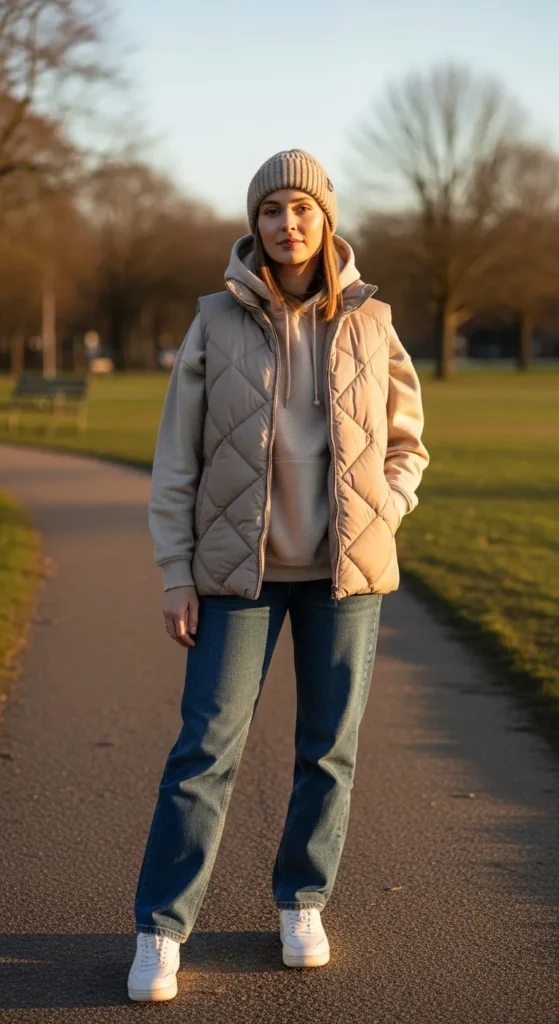 Layering a lightweight puffer vest over a hoodie adds warmth without restricting movement. Paired with relaxed jeans, this outfit feels youthful, functional, and perfect for crisp outdoor days.