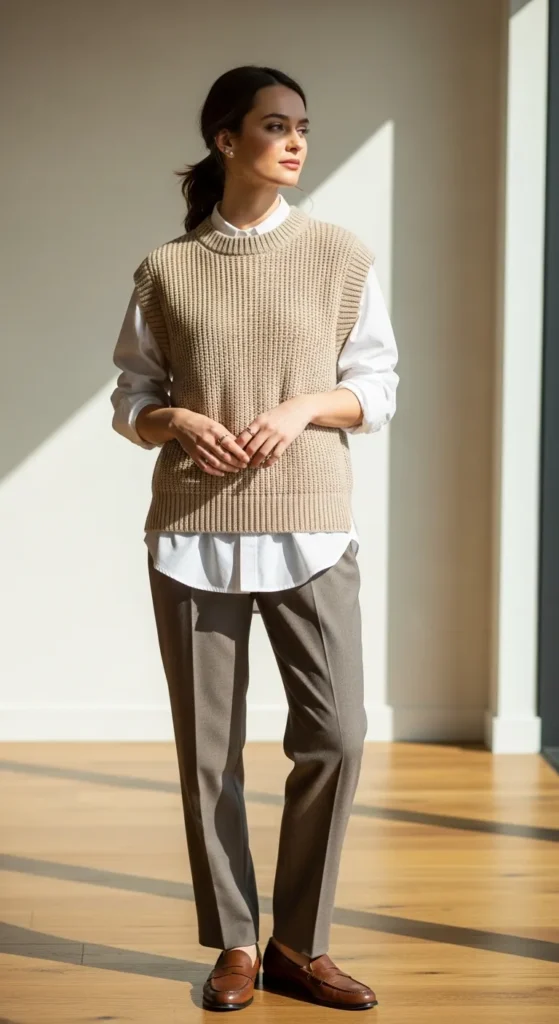Layering a sweater vest over a crisp button-down creates warmth without heaviness. Paired with tailored trousers, it feels cozy yet refined for everyday winter wear.