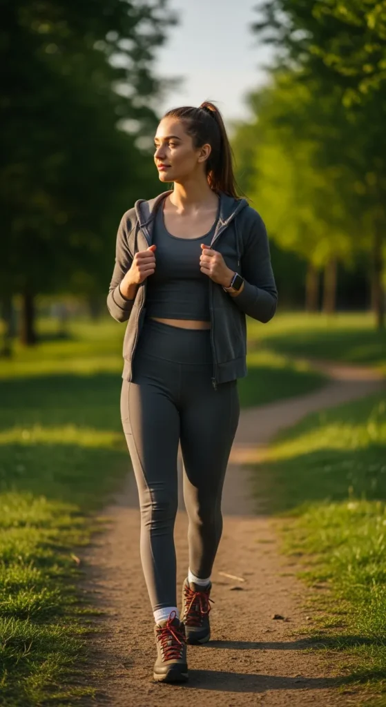 High-rise leggings with a breathable tank and lightweight zip hoodie create a fresh morning-ready look. Hiking boots add durability for longer walks and unpredictable terrain.