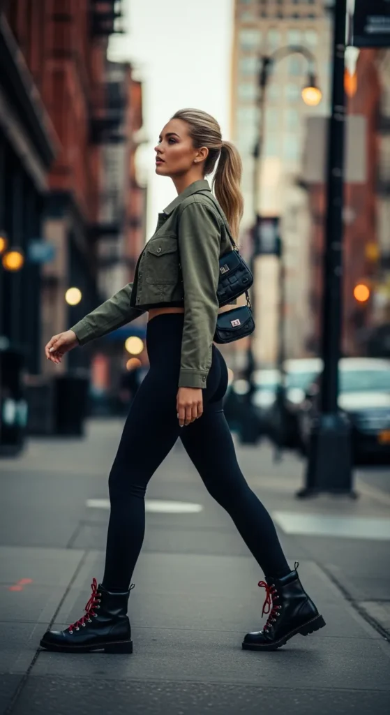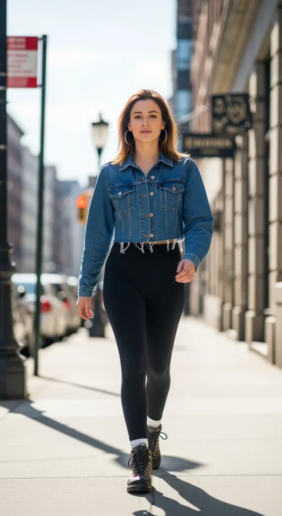 Black leggings paired with a cropped denim jacket and hiking boots blend sporty and street style effortlessly. It’s an easy go-to outfit with just the right amount of edge.
