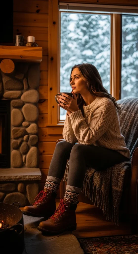 Fleece-lined leggings with a chunky knit sweater and rugged hiking boots create the perfect cozy outfit for colder outdoor settings or cabin getaways.