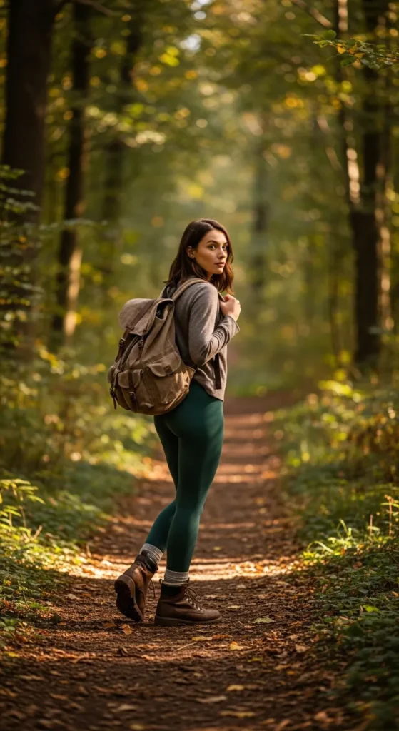 Deep green leggings paired with a neutral long sleeve and hiking boots create a grounded, outdoorsy aesthetic that feels calm and connected to nature.