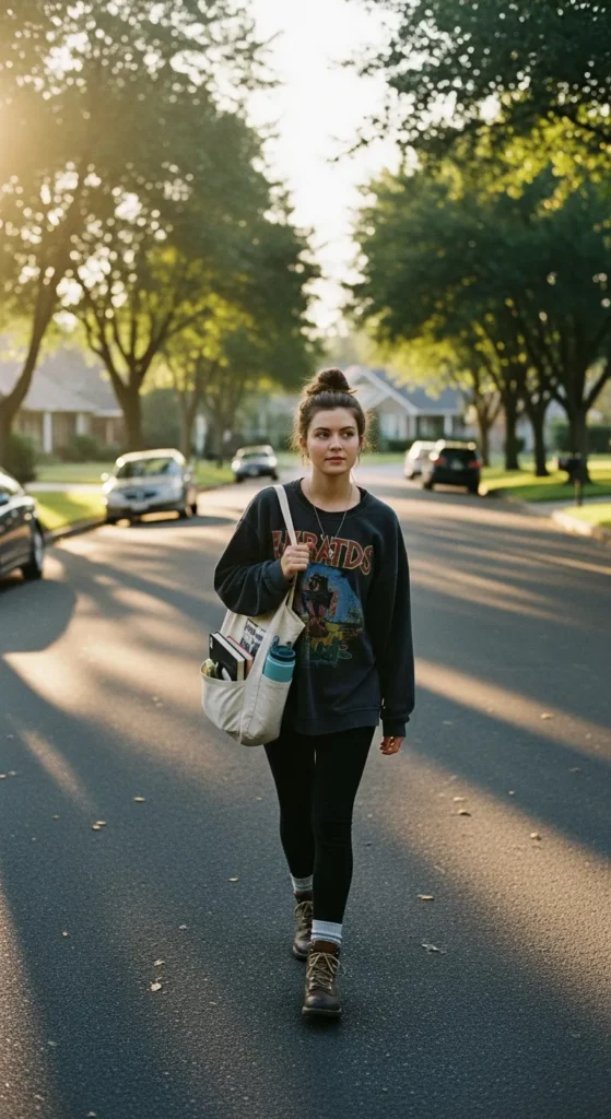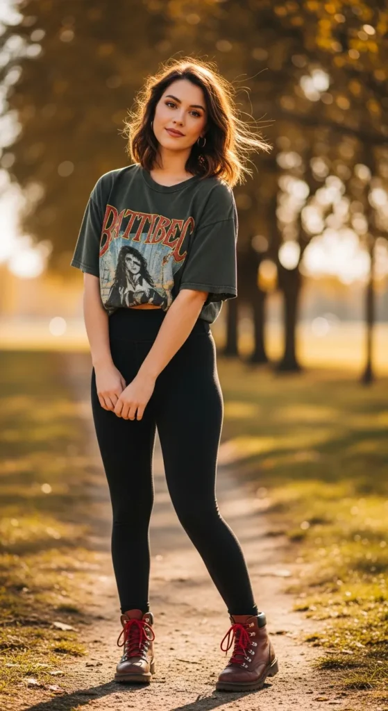 Stretchy leggings with an oversized graphic sweatshirt and hiking boots create a cozy, lived-in look that still feels stylish enough for quick errands or casual meetups.