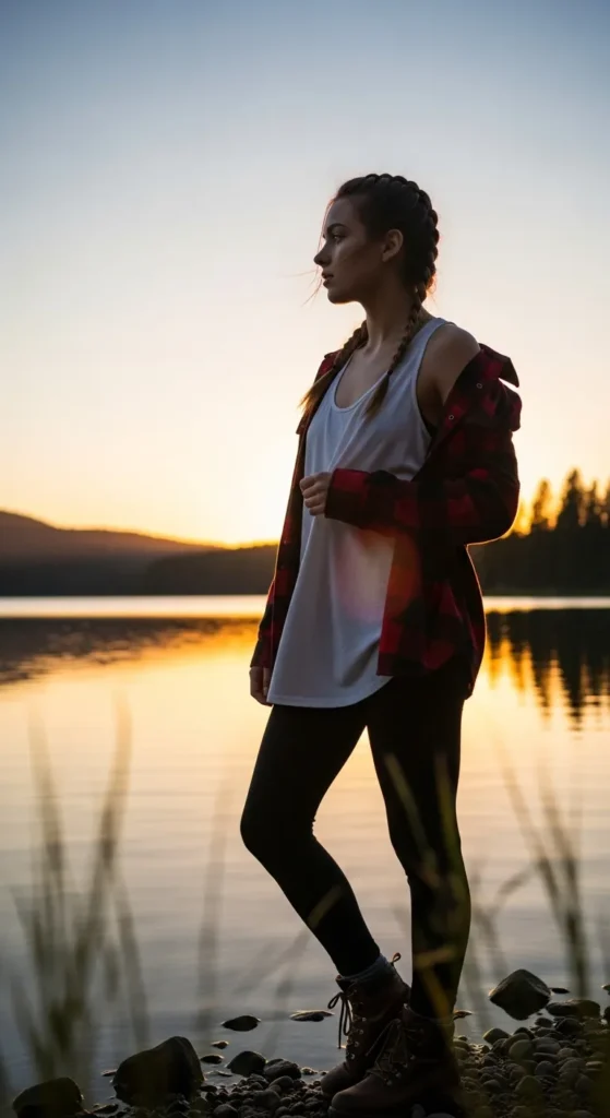 Soft leggings with a loose tank and open button-down shirt create a breezy layered look, perfect for lakeside walks or relaxed outdoor hangouts.