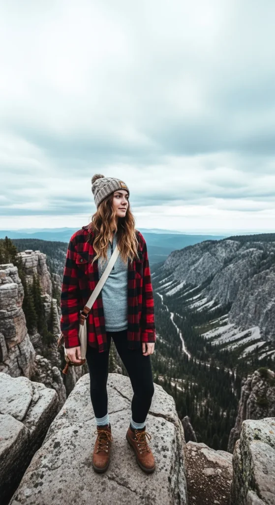 Black leggings paired with a longline thermal top and an oversized flannel shirt create a cozy, layered outfit. Hiking boots ground the look, making it ideal for cooler outdoor adventures or scenic hikes.