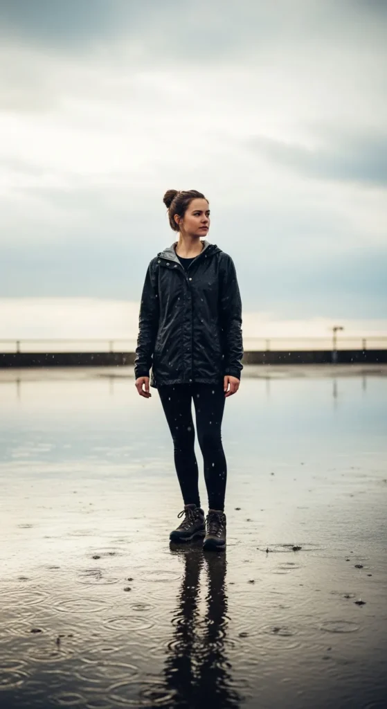 Water-resistant black leggings and a lightweight waterproof jacket paired with sturdy hiking boots create a practical yet stylish rainy-day outfit that still feels fresh and intentional.